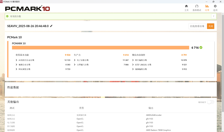 实际测试,我们把屏幕亮度调到 50%、连接 WiFi、开启 AI 助手后台,连续使用 Word、Excel,上网浏览网页,使用常用的办公软件,续航时间可以达到10小时12分钟,只本地播放1080P视频,外放音量调节到50%,屏幕亮度调到70%,可以很轻松的播放三部大片,差不多快9小时才把电量耗尽,比手机的续航强太多了,这样的话,出差的时候,在高铁就可以播放下载好的电影了,屏幕又大又省电。PCMARK10跑分测试,可以得到6716分,这个成绩相当可以。
