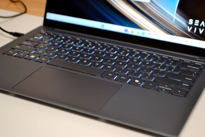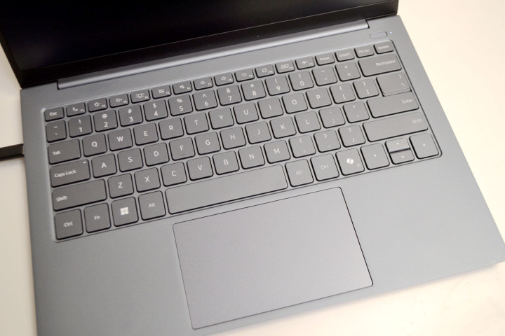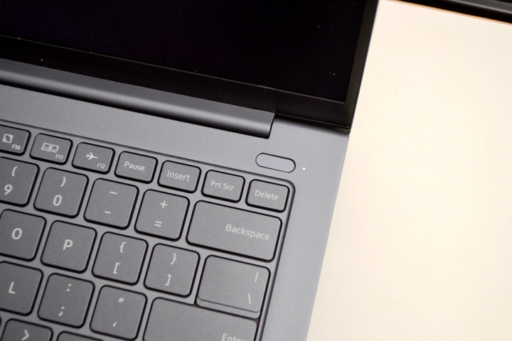 笔记本的C面是支持三级调光的白色背光键盘,键盘下面的触控板做得很大,操控起来很顺滑,另外右上角的开机键集成了指纹识别模块,可以支持一键开机识别指纹进入系统。实测解锁速度仅 0.8 秒,键盘亮度可以调节,关灯下,最低亮度就能看清按键,最高亮度也不会刺眼,晚上办公用,比没有背光的键盘要舒服很多。