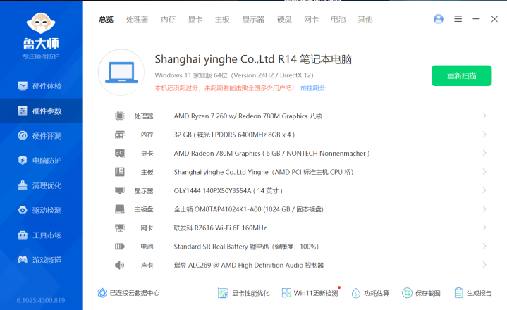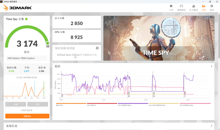 虽然这款笔记本没有独显,但是它的核显是AMD Radeon 780M ,也是目前性能方面公认第一梯队的核显,性能可以媲美桌面级入门独立显卡,实测在 1080p 分辨率下,我个人比较喜欢的3A大作,像《战神》《战地5》系列,都可以稳定跑到50fps左右,日常游戏体验蛮流畅的,而3DMARK跑分测试,可以3174分的成绩,显卡2850分,这个成绩已经很接近桌面级独立显卡1060的水准了。不过这款笔记本定位并非游戏本,所以它的屏幕并不支持高刷,但日常办公闲暇之余,玩玩游戏完全可以满足的。