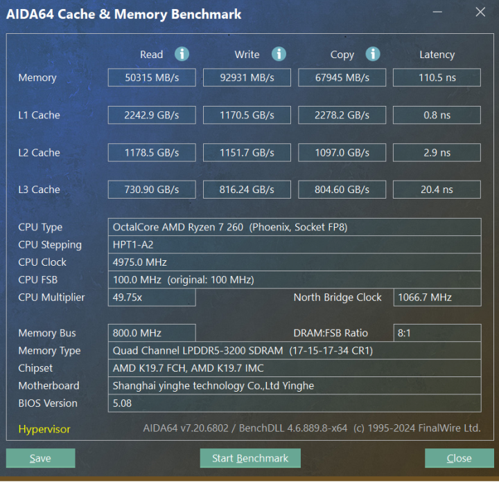 存储方面,我买的是顶配32G+1TB的版本,内存为镁光的LPDDR5 6400MHz(板载内存)32GB内存,通过 AIDA 64内存测试,其读取速度达到50315MB/s,写入92931MB/s,拷贝67945MB/s,关键的延迟只有110.5ns,性能表现不错,延迟控制也相当出色。