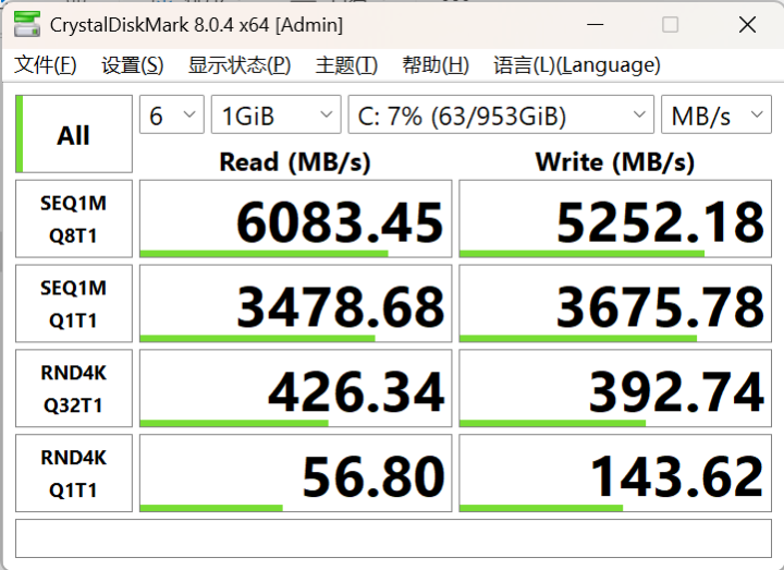 这块标配的大厂金士顿的1TB PCIe4.0 SSD,实测其顺序读取速度6083.45MB/s,写入 5252.18MB/s,官方给标配的内存和硬盘的性能跑分,都是顶级。不过,这类型的轻薄本用的大多都是板载内存,所以建议还是选32G内存的版本,后面多用个四五年也不会淘汰。