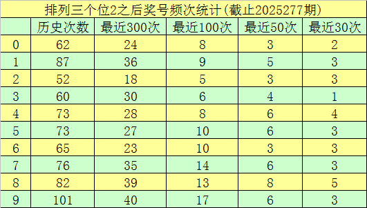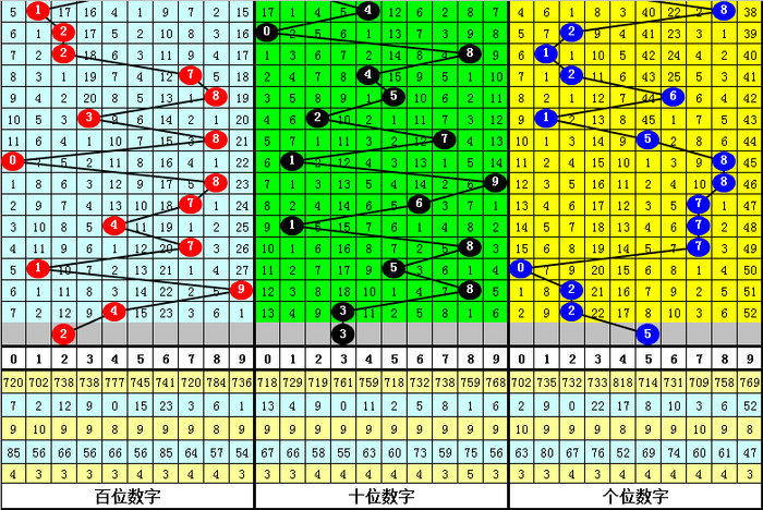 第二位杀号:第二位上期开出奖号为3,该位历史上奖号3开出了761次,最近100次第二位奖号出现3后,下期落号0-9次数从高到低分别为:号码2→13次,5、7→12次,0、1、8→10次,4、9→9次,3→8次,6→7次。